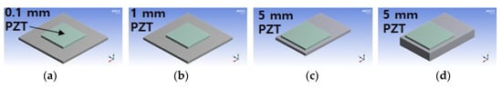 FEM model for smaller PZT sizes: (a) 0.1 mm PZT; (b) 1 mm PZT; (c) 5 mm PZT; (d) 5 mm PZT with thicker metal plate.
