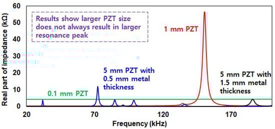 Now that we had confirmed that the FEM simulation result was reliable, four more FEM models were created to evaluate the impedance signatures. PZT patches sizing from as small as 0.1–5 mm were created to investigate for resonance. Figure 6a shows the FEM model with a 0.1 mm × 0.1 mm PZT patch with 0.01 mm thickness attached to a square metallic material on the bottom (0.2 mm × 0.2 mm with 0.01 mm thickness), Figure 6b looks identical to Figure 6a but the size is 10 times larger. The PZT size is 1 mm × 1 mm with 0.1 mm thickness with the bottom metal plate of 2 mm × 2 mm with 0.1 mm thickness. Figure 6c has a 5 mm × 5 mm size PZT with 1 mm thickness and a metal size of 6 mm × 9 mm with 0.5 mm thickness. The last FEM model, Figure 6d, has the same dimension as the previous figure but with the thickness of the metal plate increased to 1.5 mm. All four models were meshed with element quality over 0.9 to achieve the best outcome before obtaining the simulation results.
