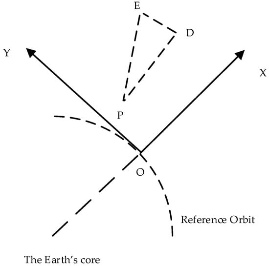As shown in Figure 1, respectively represents the pursuer, the defender, and the evader. We establish an elliptical fictitious spacecraft which is close to the players. The LVLH coordinate system is centered at the point . is pointing outward along the radius of the Earth, is perpendicular to in the reference orbital plane and points to the front of its flight direction, is perpendicular to the orbital plane and forms a right-handed frame with and .
