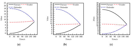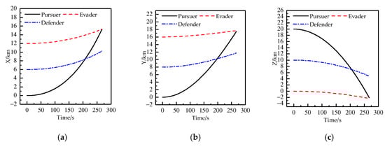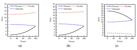 Figure 9 shows the curves of the positions of the three players changing with time in directions of X, Y, Z. As shown in Figure 9, the defender successfully intercepts the pursuer at the end of the game. Figure 10 shows the curves of the control variable of each player changing with time in the directions of X, Y, Z. At 160 s or so, the pursuer starts to change the control strategy to evade the defender. However, because of the same maneuverability of the defender and the pursuer, the pursuer does not successfully bypass the interception of the defender. Table 5 shows the position of each player at the terminal moment. From Table 5, it can be seen that at the terminal moment, the distance between the defender and the pursuer is 0.4223 km, which is shorter than the safety distance 0.5 km, and at the terminal moment, the distance between the pursuer and the evader is 1.7823 km, which is longer than the safety distance 0.5 km. All the above show that at the terminal moment, the defender successfully intercepts the pursuer and that the evader successfully evades the capture of the pursuer.