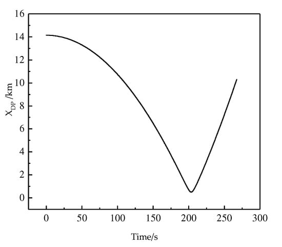 Figure 2 shows the curves of the positions of the three players changing with time in the directions of X, Y, Z. From Figure 2, it can be seen that the pursuer bypasses the interception of the defender and eventually catches up with the evader. From Table 3, it can be seen that at the terminal moment, the distance between the pursuer and the evader is 0.3598 km, which is shorter than the safety distance 0.5 km, indicating that at the terminal moment, the pursuer catches up with the evader. Figure 3 shows the distance between the defender and the pursuer during the game. It reaches the shortest distance at 203.5 s. After that, the distance between the pursuer and the defender becomes longer, the shortest distance being 0.5099 km, which is longer than the safety distance 0.5 km, indicating that during the game the pursuer successfully bypasses the defender.