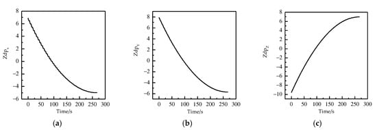 The curves of zero-control miss distance with time in (a) x-axis, (b) y-axis, and (c) z-axis.