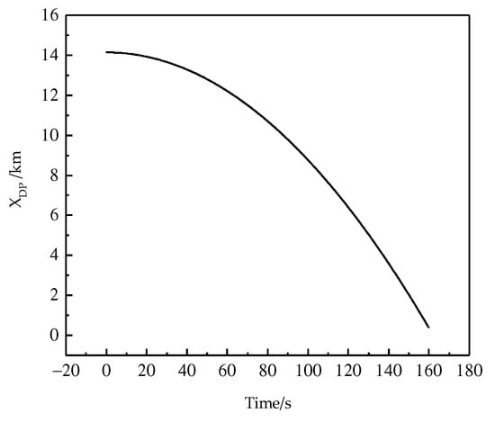 As shown in Figure 6, the defender successfully intercepts the pursuer at the terminal moment. Figure 7 shows the distance between the defender and the pursuer during the game. According to Figure 7, the distance becomes shorter and shorter in the entire game, which is caused by the pursuer’s not considering the impact of the defender. At the terminal moment, the distance between the defender and the pursuer is 0.4004 km, which is shorter than the safety distance 0.5 km.