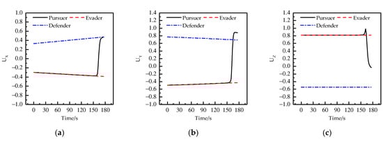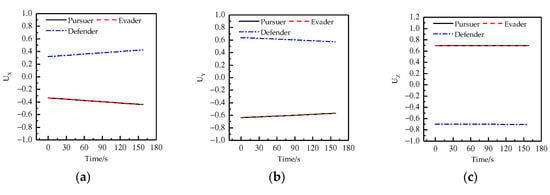 As shown in Figure 11, the defender intercepts the pursuer at the terminal moment. From Table 6, it can be seen that the distance between the pursuer and the defender in the game is 0.3959 km, which is shorter than the safety distance 0.5 km, and that the distance between the pursuer and the evader is 1.6016 km, which is longer than the safety distance 0.5 km. This shows that the defender intercepts the pursuer successfully at the terminal moment, and the evader evades the capture of the pursuer successfully. Figure 12 shows the curves of the control variable of each player changing with time in the directions of X, Y, Z. From the figure, it can be seen that the control curves of the pursuer remain overlapped with those of the evader.