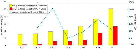 In the past decade, the renewable energy market is growing rapidly to reduce energy costs, greenhouse gas emissions, and the consumption of fossil fuels [1]. Solar energy is considered to be one of the most promising energy alternatives due to the sustainability and availability [2]. Photovoltaic (PV) systems are the most commonly applied in solar energy utilization [3]. As shown in Figure 1, the new installed capacity in 2017 in China was 53.06 GW, which was about 25 times of the installed capacity in 2011, and accounts for half of the global newly installed capacity. In China, the domestic PV power market is undergoing a profound change with the shift to an independent power sources.