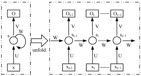 An RNN is defined as an ANN with arbitrary connections between neurons, usually fully connected between adjacent layers. It models temporal dependencies present in time series data through the use of feedback connections and aims to ‘remember’ the values at previous time steps. As shown in Figure 2, it gives a simple RNN with one input unit, one output unit, and one recurrent hidden unit unfolded into a full network. ot is the output at time step t, xt is the input at time t, st is the state at time step t, and it is the ‘memory’ of RNN. W, U, and V are parameters in different network layers, and an RNN can share the same parameters (W, U, and V above) across all steps [28]. The process can be expressed as