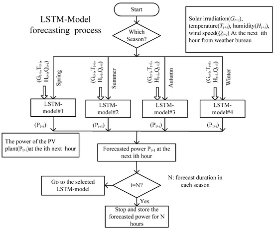 The deep RNN models with LSTM units presented in this paper were developed in order to predict PV power values in 1-h resolution over 3 consecutive days. The proposed models were tested in different seasons. A schematic block of the LSTM used to forecast the profile of the power produced by the PV plant is depicted. Figure 4 shows that there are four models for forecasting PV power in different seasons based on next 1 h of meteorological data.