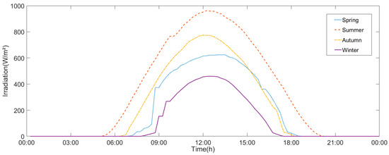 The four seasons’ periods over diurnal variations in irradiance (spring: 12.3 h; summer: 14.7 h; autumn: 12.7 h; winter: 10.2 h).