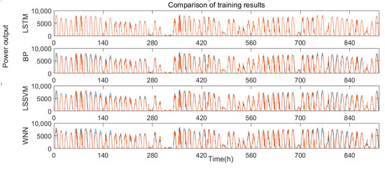 The training trends of each algorithm are shown in Figure 9 and the error analysis of each algorithm are shown in Table 4, the RMSE and MAPE values for LSTM are respectively 4.07% and 1.52%, while the RMSE and MAPE values for back propagation (BP) networks, least squares support vector machine (LSSVM) and wavelet neural (WN) networks are respectively 16.61% and 2.82%, 16.38% and 3.44%, and 21.29% and 4.83%. The obvious low values indicate that the training result of the LSTM model has a high level of accuracy.