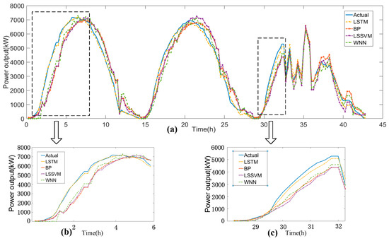 Different model structures have been analyzed and the optimal model for each season has been determined in the above. Figure 10b,c are the partial enlarged views of Figure 10a. In Figure 10b, it can be observed that the fitting performance using LSTM is better than using other algorithms with a long delay in the first six hours. There are some unknown down trend which cannot accurately forecast actual power trends. As shown in Figure 10c, in the case of large weather fluctuations, the power could be effectively predicted by all proposed algorithms, but the forecasting results using LSTM have little error compared to actual power because of the ability of faster perceiving changes from historical data, while the values of prediction using other algorithms are much smaller than the actual value. It can be concluded that the forecasting method using LSTM shows better performance with no delay in sunny days and less error in cloudy day. The same prediction situations appear in the following three figures.