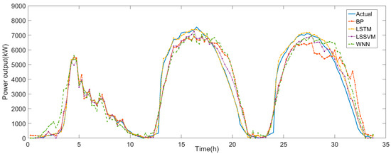Figure 10a, Figure 11, Figure 12 and Figure 13 show forecasting performances for three consecutive days using optimal LSTM model in each season and comparisons with BP networks, LSSVM and WNN networks. As shown in Figure 12. In the periods of 2nd to 5th hour and the 25th to 28th hour, except LSTM algorithm, the predicted trends of other algorithms showed larger error with the actual power trend. Its RMSE value could reach 13.86%, which is higher than other seasons. In Figure 13 starting from the 13th hour, the results predicted by other algorithms lag behind the actual ones. After the 30th hour, the same error appears in the LSTM model. It can be seen that the prediction accuracy under ideal weather type is not high, because the diversity of power generation trends under this type is lacked in training set. It can be observed that LSTM model exhibits optimal forecasting in each season and shows the similarly good forecasting performance for non-ideal weather types compared to the ideal weather type. RMSE and MAPE values of forecasting are shown in Table 4. It shows that the RMSE values of forecasting using LSTM models in four seasons are respectively 5.34%, 9.57%, 13.86%, and 9.26%, while the lowest values using other algorithms are respectively 18.8%, 13.03%, 20.94%, and 17.74%. In addition, it demonstrates that the forecasting results in autumn are not particularly ideal with RMSE value of 13.86%. However, the LSTM model still shows the best performance compared with other algorithms.