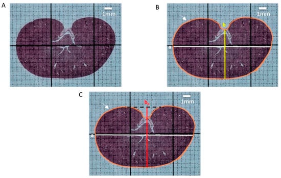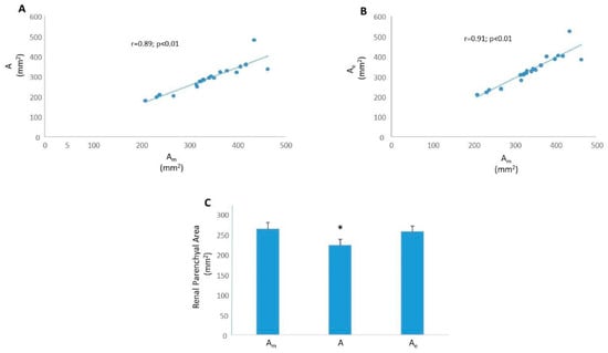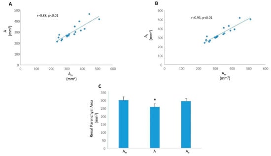 was used to calculate the renal parenchyma area. Calculated renal parenchymal areas, A, using b, or Ae using the extended be, were expressed in mm2. Additionally, renal parenchymal area (in mm2) was measured by planimetry using the “area measurement” tool available in the software.