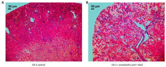 Aristolochic acid + NaCl-induced kidney disease in mice. Representative photomicrograph (4X) of Masson’s Trichrome-stained kidneys from a control CD-1 mouse (A) and an aristolochic acid + NaCl-administered CD-1 mouse (B). Renal interstitial scarring is clearly evident in the latter.