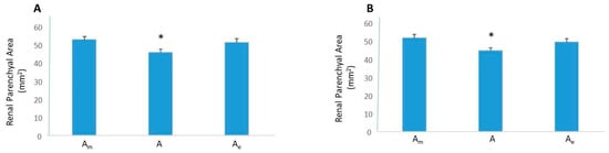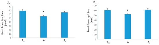 Renal parenchymal area in healthy and diseased mice (aristolochic acid + NaCl). Left and right kidneys were sourced from healthy adult male CD-1 mice or adult male CD-1 mice with aristolochic acid + NaCl nephropathy. (A) In coronal left kidney slices, Am is greater than A (*, p < 0.01) but not different from Ae. (B) In coronal right kidney slices, Am is greater than A (*, p < 0.01) but not different from Ae.
