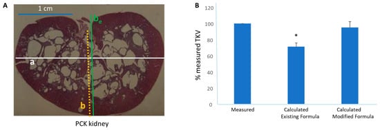 Measured vs. calculated total kidney volume (TKV). (A) An H&E-stained coronal renal slice from a PCK rat. The major axis (a), minor axis (b), and extended minor axis are shown (be). (B) Kidney volume calculated using the existing formula was lower than measured TKV whereas kidney volume calculated using the modified formula was not different from the measured TKV (*, p < 0.01 vs).