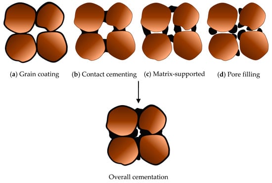 Cementation mechanism of microbial induced carbonate precipitation (a) grain coating; (b) contact cementing; (c) matrix-supported; (d) pore-filling.