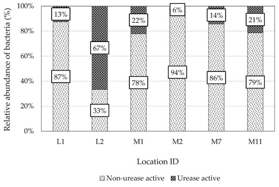 Relative abundance of ureolytic bacteria in different sampling locations.