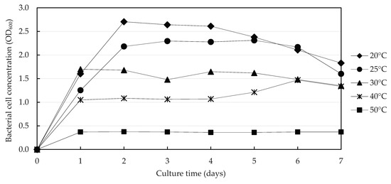 Variation of bacterial cell concentration of Sporosarcina sp. at different temperatures.