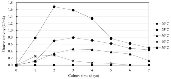 Variation of urease activity of Sporosarcina sp. at different temperatures.