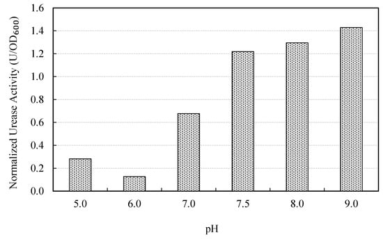 pH has a significant influence on urease activity and, hence, the success of MICP. Under highly acidic or alkaline conditions, the urease enzyme is generally irreversibly denatured [49,51]. Figure 6 depicts the degree of change in urease activity at different pH levels. It is evident from the results that, urease activity increases rapidly from pH 6.0 to 9.0 and the enzyme is comparatively more active in the pH range 7.5–9.0. Mobley et al. [51] reported that majority of the microbial ureases, except for a few acid ureases, are optimum under neutral pH conditions. However, the findings of Stocks-Fischer et al. [13] are on the same trend as this study: They reported that urease activity of Sporosarcina pasteurii, drastically increased from pH 6.0 to 8.0 and gradually reduced thereafter. Nevertheless, the activity at pH 9.0 for that specific strain was still satisfactory for MICP applications. Ciurli et al. [52] are other researchers who have shown that optimum pH for urease activity of S. pasteurii is 8.0. Moreover, few other microbial strains have showed their optimum performance at pH 8.0, as reported in literature [49,53]. From the aforementioned results, it is clear that the isolate used in this study is moderately alkalo-tolerant and can be successfully employed for the target application in a coastal environment.