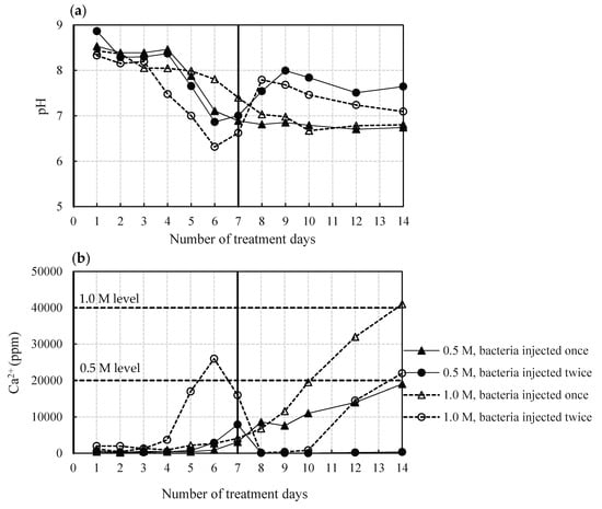 The reactant and the bacteria cell concentration are two primary factors that governs the degree and the homogeneity of the strength increment over the treatment depth. The local strength of sand specimens underwent different treatment conditions with respect to the aforementioned two parameters, are illustrated in Figure 7. However, the cementation reagent contained equimolar concentrations of urea and CaCl2 as in Ng et al. [54]. All the samples were strongly cemented and the estimated average (as well as individual) UCS values from two independent tests for all the cases were above 3 MPa. When the two samples injected with 0.5 M cementation solution were considered, it was clear that the specimen with bacteria injected twice showed a significant strength increment than that of the specimen injected with bacteria only in the beginning. According to previous records, it is deduced that higher concentrations of bacteria populations enhance the amount of CaCO3 precipitate and, thus, the results of MICP treatment [41]. Generally, bacteria play two key roles in the biocementation process; (i) catalysis of urea hydrolysis and (ii) provision of nucleation sites [55]. The initial investigations on urease activity of the isolated strain showed that enzymatic activity diminishes over time. Besides, there are several other factors that may gradually inhibit the bacteria‘s affinity to perform their intended role as a catalyst for urea hydrolysis over the entire treatment time period. Possible reasons are hydraulic constraints such as cell encapsulation from the resulting precipitate or being confined inside pores, restricted movement of nutrients and precipitation components as pore spaces get narrowed after initial precipitation, space constraints in the case of saturated conditions, accumulation of metabolic wastes and also flushing out of bacteria [50,56]. Further, bacterial cell walls act as nucleation sites for CaCO3 precipitation in biochemical processes [13,57] and some of the above mentioned factors may lower the availability of cells that can serve this purpose. Therefore, it is concluded here that the rate of urea hydrolysis and subsequent biocementation was retarded over time in the case where bacteria was injected only in the beginning, whereas the urease activity was regained and number of nucleation sites were improved with the reinjection in the case where culture was injected twice, leading to a better performance. This phenomenon was further confirmed by the measurement of Ca2+ concentration and the pH of the samples collected from the solution draining out from the outlet (Figure 8). Better performance of microbial induced carbonate precipitation was characterized by lower Ca2+ concentration and higher pH values as soon as the bacterial culture was injected.