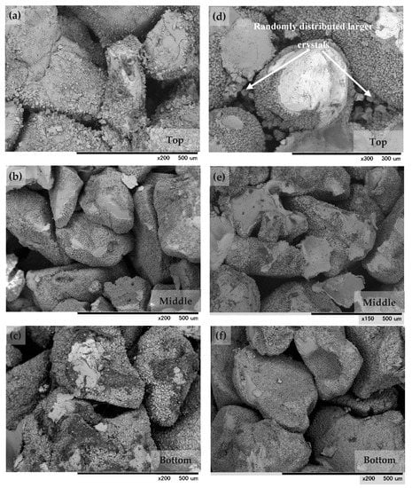 In the case of 1.0 M treatments, although grain surfaces were predominantly covered with uniformly sized crystals, the precipitation had become more random as more calcite formed. Larger crystals of approximately 30 µm in size were randomly distributed, filling the pore spaces in the top portion and clogging near the injection point (Figure 9d). Ng et al. [54] stated that flow would be obstructed even without any specific binding of soil particles as long as precipitated crystals are larger than the pore throat. Moreover, only thin layers of differently sized CaCO3 crystals were present away from the injection top, thus showing greatly hindered precipitation (Figure 9f).