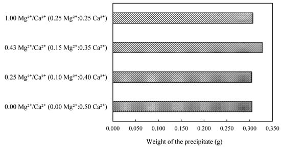 Although Mg2+/Ca2+ molar ratio was raised from 0 to 1, no remarkable change in the amount of precipitate was observed. However, the amount of carbonate precipitate slightly increased up to 0.43 Mg2+/Ca2+ ratio and then decreased as Mg2+ was further raised until ratio became 1. Therefore, it was deduced that a Mg2+/Ca2+ ratio approximately equaled to 0.5 is the optimum condition in this case. Similarly, in a study by Sun et al. [38] demonstrated that magnesium carbonate has a lower productive rate than calcium carbonate resulting much lower magnesium carbonate precipitation than that of calcium carbonate in any specific condition. Further, Fukue et al. [65] claimed that the total amount of precipitation decreases with an increase in Mg2+/Ca2+ ratio from 0 to 2.3. This may be attributed to the higher solubility of magnesium carbonate which is almost one order of magnitude higher than its calcium counterpart and/or the possibility of partial hydrolysis of magnesium carbonate to generate magnesium hydroxide [38].