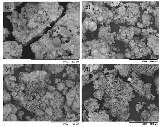 Scanning electron microscopy (SEM) images of microbial induced precipitate by Sporosarcina sp. with (a) Mg2+/Ca2+ = 0.00; (b) Mg2+/Ca2+ = 0.25; (c) Mg2+/Ca2+ = 0.43; (d) Mg2+/Ca2+ = 1.00.