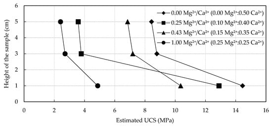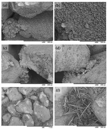 Stepping up the Mg2+/Ca2 ratio from 0.43 to 1.00 drastically changed the crystal morphology of the biocement. Grains were slightly cladded by small crystals while pore spaces were completely occupied by needle shaped crystals, some as long as 100–200 µm (Figure 14e,f). Apparently, these thin crystals, individually fanning out in all directions over the void spaces, had a very low binding capacity compared to the rhombohedral/spherical crystals accumulated together at grain contacts. Further, thin needle shaped crystals can be easily subjected to destruction on application of compressive forces compared to the rhombohedral or spherical crystal aggregates. These results are in good agreement with that of Gawwad et al. [73] who showed that the occurrence of needle cement in the presence of higher concentrations of magnesium deteriorates the compressive strength of the bio-mortar prepared by the common ureolytic bacterium Sporosarcina pasteurii. However, the majority of the studies done to address this aspect has revealed that magnesium addition enables the biocement to have a higher strength, lower porosity, and better resistance to acids compared to control samples in absence of magnesium [19,38,65,70,75,76]. The general understanding from the above studies is that the inherent properties of aragonite, such as higher specific gravity and Mohs hardness than those of calcite and morphology which provides a denser, compact arrangement, can be the possible reason for better results. The exact reasoning to this discrepancy in results are not fully discovered yet and need more investigation.