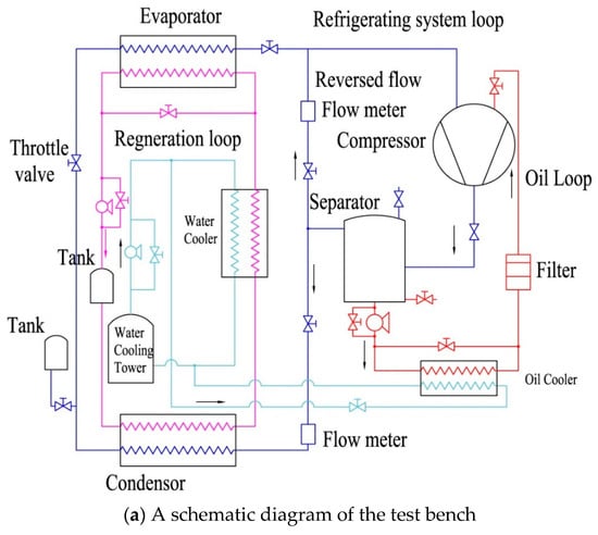 Figure 1 shows a schematic diagram and a picture of the experimental test bench. It consists of three loops, being the refrigerating system loop, the regeneration loop, and the oil circulation loop. In the refrigerating loop, the refrigerant flows into the compressor, where it mixes with the oil. The refrigerant-oil mixture is discharged from the compressor into the separator, where the refrigerant and oil separates. The refrigerant vapor flows to the condenser, where it is condensed and then is throttled into the evaporator. In the evaporator, the refrigerant absorbs the thermal energy from the regeneration loop and vaporizes. Then the refrigerant vapor enters the compressor, and the next cycle starts. The lubricating oil is injected into the refrigerant in the compression chamber to cool the compressed refrigerant vapor. At the same time, the oil seals the compressor linkage path and lubricates the compressor. In the regeneration loop, water circulates between the condenser and evaporator to transfer the thermal energy from the condenser to the evaporator. In the oil circulation loop, the oil separated from the separator flows into the oil-water heat exchanger, where it is cooled by the cooling water from the cooling tower. The cold oil is then introduced to the compressor. Some of the oil is injected into the compression chamber to cool the compressed refrigerant vapor, in order to control the discharge refrigerant temperature, while the remaining oil is used to lubricate the bearings of the compressor.