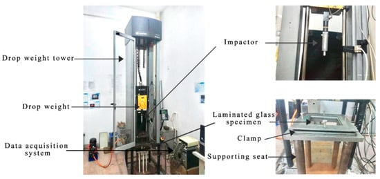 The laminated glass used in this experimental study was provided by Guangzhou Huafeng Safety Glass Co. Ltd., No. 68, Big Bridge street, Xilang, Liwan District, Guangzhou, Guangdong, China. The drop-weight tests were carried out by Instron® Dynatup 9250 HV impact instrument, as shown in Figure 1. The Instron® Dynatup 9250 HV impact instrument used in this experiment was manufactured by Instron®, 825 University Ave. Norwood, MA 02062-2643, USA. The impact test apparatus consists of a drop tower equipped with an impactor that can vary the balance weight, and a high-speed data acquisition system was also equipped to obtain data during the test. The test machine can adjust the impact energy by adjusting the weight mass or the drop height. During the test, the laminated glass specimen was supported by a clamper which mainly consists of the nut, bolt, a pair of rubber cushions and a pair of steel clamp plate. The specimen was placed in the clamper and the bolt was tightened. The clamper was placed on the supporting seat.
