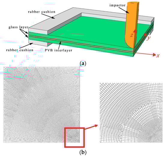 The average mesh size was 1 mm. At the area near the impact regions, glass layer, PVB interlayer and impactor were meshed with denser elements. As a result, the mesh size around the contact point was 0.5 mm. The hourglass mode was carefully checked in the mesh model. In order to prevent the zero-energy mode of the element, the mesh model with different number of elements through-thickness were pre-simulated. When the proportion of artificial strain energy is 10% less than the internal energy, the accuracy of the mesh model is satisfied. Through some pre-simulations, the element size in the thickness direction was set to 0.3 mm. In the thickness direction of PVB interlayer, it was meshed into four elements. An eight-node linear brick element with reduced integration was adopted in this finite element model. The Figure 3b shows the mesh model of the glass layers and the PVB interlayer shares the same meshing pattern.