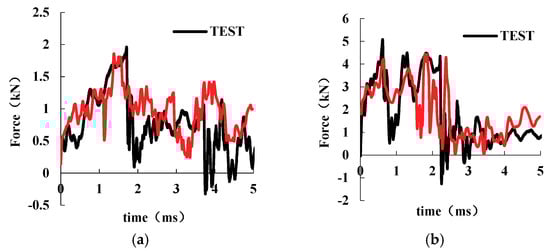 Figure 5 depicts the force-time curves of impactor. Obvious vibration can be detected along the force-time curves, which mostly results from the reflection of stress wave. The vibration is serious in Figure 5a,b owing to the bigger impact velocity.