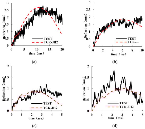 Figure 6 presents the deflection-time curves of the central point of the laminated glass pane from the experimental results as well as the numerical simulation results conducted with the combined TCK-JH2 model.