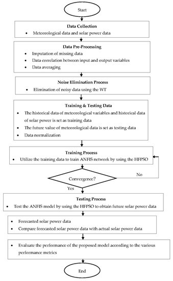 This work proposes the WT-ANFIS-HFPSO as a model to forecast future solar power data. As for the first part of this work, the WT approach is utilized to eliminate the noise in meteorological data and solar power data that is collected from the Universiti Teknikal Malaysia Melaka (UTeM). The existence of noise has caused the data to be non-stationary and led to inaccurate forecasting. By utilizing WT as the noise elimination tool, the accuracy of a forecasting model can be improved. In the second part of this work, the denoised data is introduced to the ANFIS model where the HFPSO algorithm is employed to optimize the premise parameters of the ANFIS. The HFPSO algorithm refers to the merging of two optimization algorithms (FF and PSO) into a single framework. The hybridization mitigates the disadvantages and brings out the advantages of both algorithms to yield more favourable model performance. The schemes of the forecasting strategy of the WT-ANFIS-HFPSO can be depicted in the flowchart as shown in Figure 1 where all of the forecasting strategies are implemented in MATLAB R2015a language.