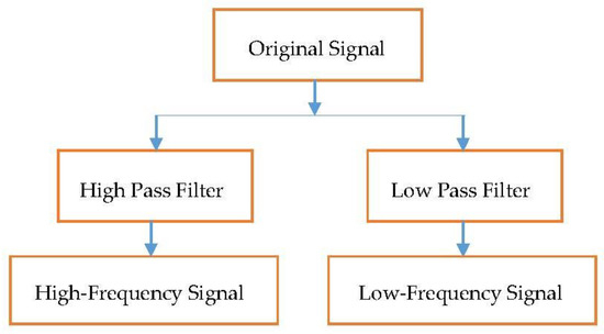 The WT is a method that transforms time series data into time-frequency representation and becomes a superior alternative of the Fourier transform (FT) to analyze stationary and non-stationary data [24,27]. In the theory of WT, an original signal is decomposed into two parts; a low-frequency signal and a high-frequency signal. The process is called the wavelet decomposition process, which is represented in Figure 3.