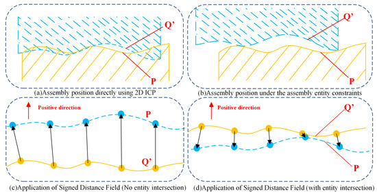 - Compute any state of Q′ with one contact point using ICP and ensure (Figure 3a). The contact point is defined as .