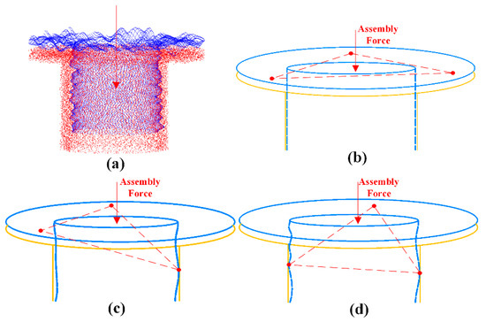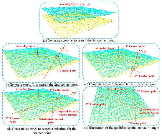 - Check if the current spatial contact triangle is qualified using the assembly force constraints rule: and . If the conditions are not met, choose the two contact points that constitute a line closer to (in Figure 3d) and go back to step (3). Once the conditions are met, the current condition of Q′ is the qualified assembling condition, as shown in Figure 3e.