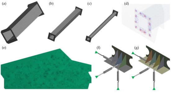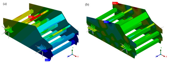 - Beam model. The vibrating screen has one exciting beam, two reinforcement beams, and a dozen bearing beams. In order to ensure that the calculation is accurate and it is easy to load the alternating forces, SOLID elements are adopted for the beam models, as shown in Figure 2a–c;