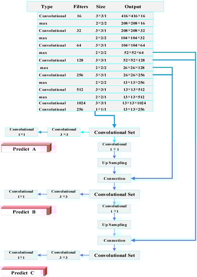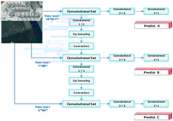 Relative top-down architectures with skip connections are popular in state-of-the-art object detection research. The YOLOv3-tiny creates a feature pyramid with strong semantics at two scales by adopting subsampling layers and a fusion approach. As shown in Figure 1, the size of the two scales are 13 × 13 and 26 × 26, which are obtained in the detection of ordinary size target, respectively. Finally, two scales are merged in the end. The architecture is constructed as a feature pyramid, wherein predictions are independently made on each level. The feature pyramid has rich semantics via a top-town pathway and lateral connections []. In this way, YOLOv3-tiny has the ability to detect small targets.