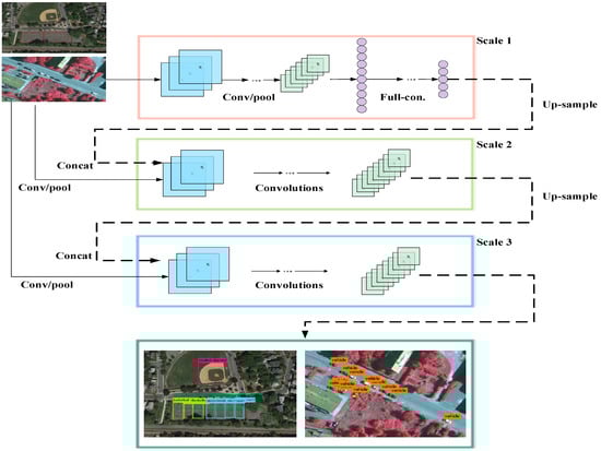 In the proposed TF-YOLO network, these three scales are used to detect targets in various sizes. The network performs large-scale detection in size map and detects the moderate-scale target in . The small target is detected in size map. By connecting the multiple features of the same scale, the TF-YOLO network prominently promotes the ability to detect objects. The feature extraction workflow of the TF-YOLO network is shown in Figure 5.