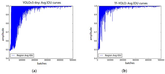 The comparison of intersection over union (IOU) curves obtained by two networks: (a) YOLOv3-tiny network; (b) TF-YOLO network.