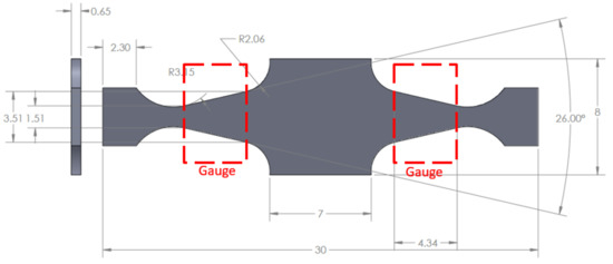 Drawing of the dual gauge section Krouse type mini specimen, all units are in mm.