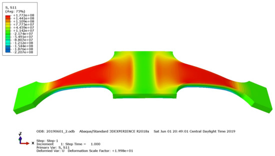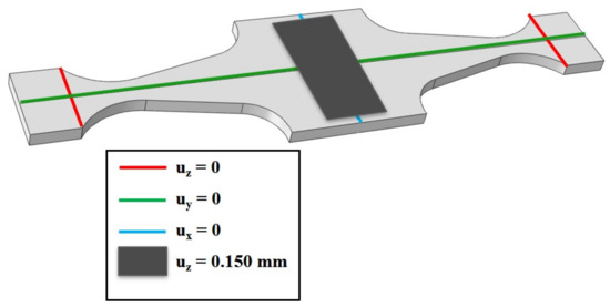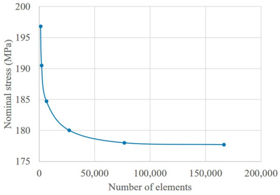 Finite element analysis was performed using ABAQUS 2018 software (Dassault Systèmes Simulia Corp; Providence, RI, USA) to demonstrate the constant stress distribution within gauge sections. According to the specimen design, as shown in Figure 2, the 3D prototype of the specimen was simply supported at both sides which are marked by red lines . To ensure a symmetric deformation, the displacement on center-lines along the x -axis (green line) and y-axis (blue line) are restricted in y direction and x direction , respectively. A constant displacement = 0.150 mm was applied on the 3 mm × 7 mm dark grey rectangular area at the center of the specimen, which indicates the rectangular plate washer in the machine setup. Boundary conditions are listed in the box under the 3D prototype of the specimen. The Young’s modulus and Poisson’s ratio set for the wrought 304 stainless steel were 200 GPa and respectively. A linear elastic model was applied to observe the mechanical response under this static condition, as the deformation is within the elastic regime. The distribution of the nominal stress S11 on the whole specimen is then obtained by the simulation, as shown in Figure 3. A constant nominal stress within triangular gauge sections can be observed, and it reaches the maximum value at the surface. Convergence study was also performed by selecting 6 different mesh sizes which result in the number of elements ranging from 1263 to 166,506. The data points in Figure 4 shows that the nominal stress converges to approximately 177.7 MPa as the number of elements increases to 166,506, since when the number of mesh elements increases from 76,698 to 166,506, the change in nominal stress value is less than 0.2%. Figure 3 exhibits the nominal stress distribution with the number of elements of 166,506. The sole purpose of using FEA analysis is to demonstrate the stress distribution within the gauge.