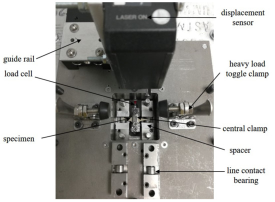 The mini fatigue testing machine consists of six major parts: (i) an electromagnetic actuator, (ii) a non-contact displacement sensor, (iii) a load cell, (iv) a controller, (v) a power amplifier or driver, and (vi) a test bench. The voice coil of a subwoofer was used as the actuator. The sub-woofer behaves as a low audio frequency shaker. The mathematical model of an electrodynamic shaker and a sub-woofer is relatively similar though the moving elements of a shaker are more rigid than a subwoofer. Higher rigidity multiplies the power requirements. To design a low power system, a soft mechanical suspension of the sub-woofer was implemented to transfer maximum energy to the specimen. The actuator is made of a high Curie temperature ferrite magnet with a cast aluminum frame of 10 inches diameter. The larger diameter of the voice coil (3 inches) than the length (1 inch) of the specimen supports the one-dimensional movement. The dust cap of the voice coil was replaced with a plastic flange. A load cell was mounted in-line between the central clamp and the flange to measure the tensile and compressive force. To measure the displacement of the specimen, a high-speed non-contact laser displacement sensor was fixed with a guide rail. Figure 5 illustrates the test bench setup. First, the specimen was clamped at the center. The specimen sits on the bearings at both ends as shown in Figure 5. Spacers were used at both ends to ensure no preload on the specimen. Then, the other bearing holders were placed and clamped using heavy load toggle clamps on top. To ensure line contact at both ends, bearings were used. Bearings also minimize the friction during the simply supported vibration test. By sliding the displacement sensor using the guide rail, the sensor was pointed at the center of the specimen. The displacement measured by the sensor was processed using a microcontroller to determine the amplitude and mean of the displacement. The data was sent to a computer from the microcontroller using a serial port. An adaptive controller was implemented in the Python development environment to estimate the required amplitude of the sinusoidal control signal. The signal from the computer was sent to a waveform generator via Ethernet. A linear power amplifier connected with the waveform generator drives the actuator. All process and manipulated variables were stored for further analysis to identify the nucleation and propagation phase.