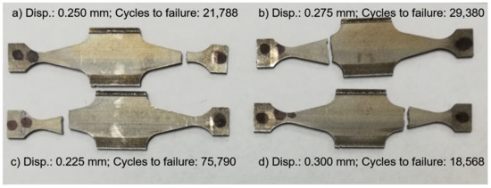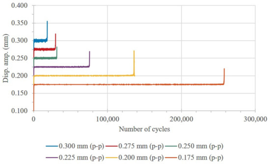 Fatigue failure of specimens actuated at different displacement amplitude.
