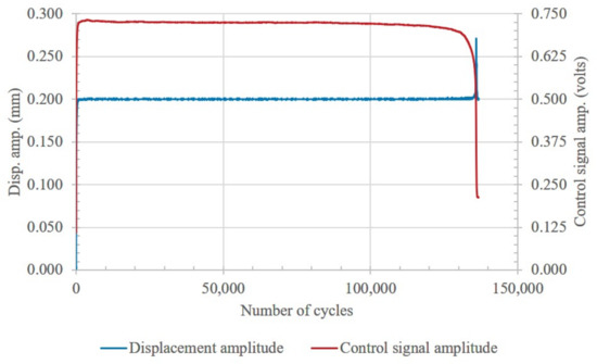 Displacement and control signal amplitude up to the entire fatigue life cycle of a fine finished wrought specimen.