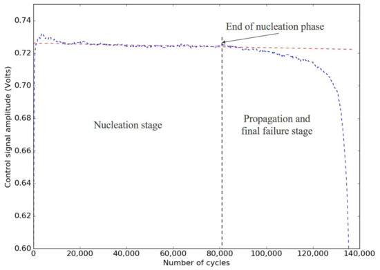 There are several techniques already developed to monitor the crack nucleation and propagation during the fatigue test. These techniques include the acoustic emission diagnostic method [25,26,27], electrical resistance change method [28,29], meandering winding magnetometer (MWM)-array eddy current sensing [30], and thermographic method [31]. All of these techniques require an additional sensor with intensive signal processing. In the current work, we introduce a simple but effective control signal monitoring (CSM) method to identify the nucleation and propagation phase. In a displacement-controlled mechanism, the control signal decreases with the decrease in the structural stiffness of the specimen. The change in the control signal provides insight in estimating the nucleation and propagation phase. In this study, the fatigue test was conducted on wrought 304 and additively manufactured 304L stainless steel specimens. The CSM method was applied to identify the nucleation and propagation phase. The test results were compared to validate the design of the specimen and the test setup performance in high cycle fatigue testing.