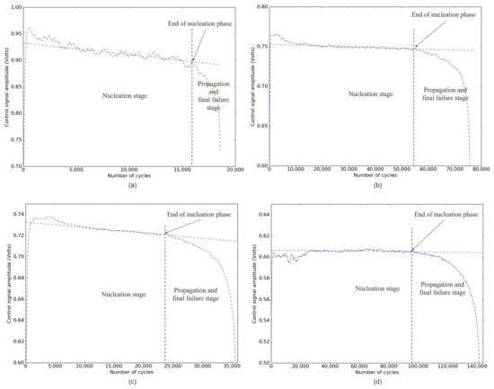 In this study, we introduce a control signal monitoring (CSM) method to identify the nucleation and propagation stage. During the fatigue test, the crack first grows slowly, which is termed as nucleation. When the nucleation process ends, the crack starts propagating and the final failure occurs. The stiffness of the specimen decreases at all stage, but the rate of the stiffness change is different. Wang [42] reported for carbon fiber polymer-matrix composite that the stiffness of the material has an inverse analogous relation with the change in resistance up to the end of nucleation phase while performing the electrical potential technique on fatigue test to identify the nucleation and propagation phase. Grammatikos [31] implemented the linear regression analysis on the relative potential change as a function of fatigue life fraction to identify different stages. Similarly, this is possible to identify the phases using linear regression analysis on the control signal. First linear regression was applied on the control signal. Then the peak amplitude of the signal near the end of regression line was marked as the end of nucleation phase, as shown in Figure 10. Here the regression helps in choosing the peak of the signal. Current study demonstrates the implementation of CSM method. Future study includes the sensitivity analysis on the monitoring signal. The implementation of the CSM method on other wrought and SLM specimens is shown in Figure 11. To determine the maximum nominal stress, the average of the peak load was calculated up to the end of the nucleation phase. Inserting the average in Equation (4), the nominal stress was calculated. Figure 12 shows the tensile and compressive load response up to the final failure for the wrought specimen displaced at 0.200 mm amplitude.