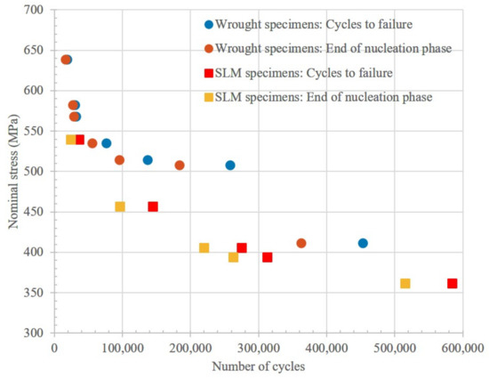 End of nucleation phase and cycles to failure for fine finished wrought and SLM fabricated specimens.